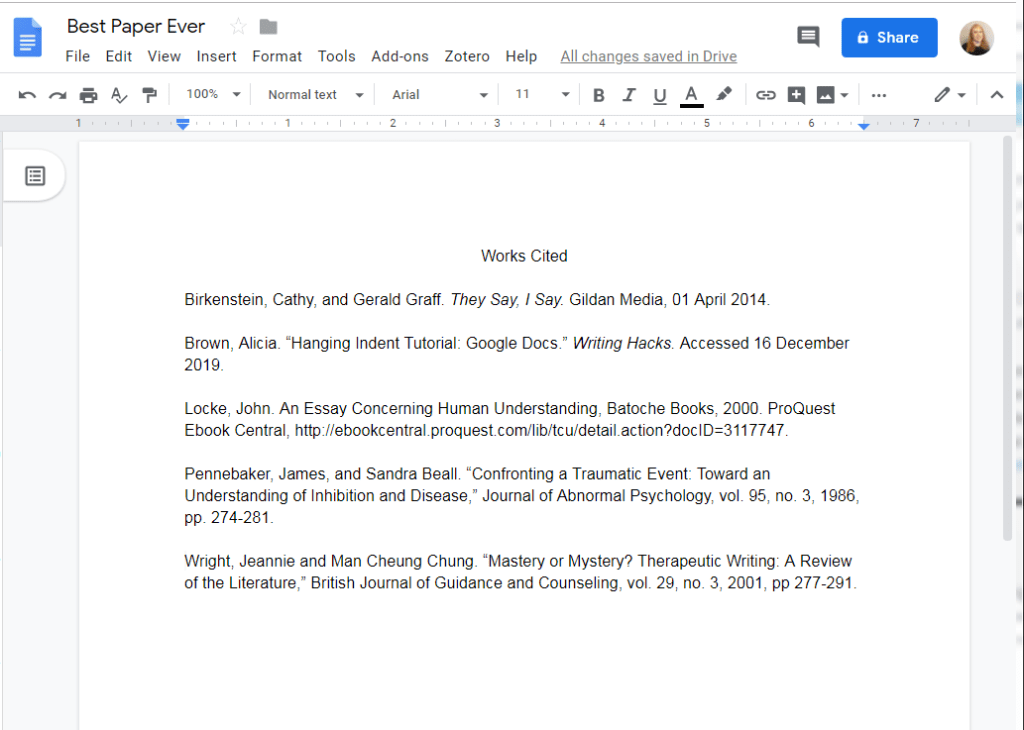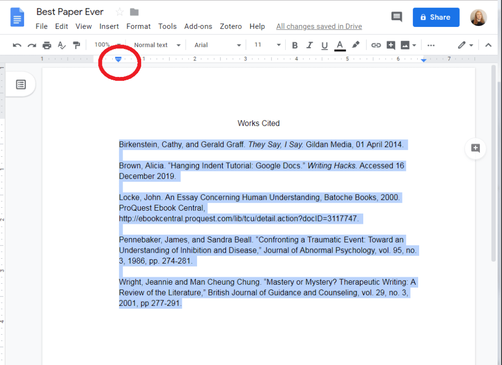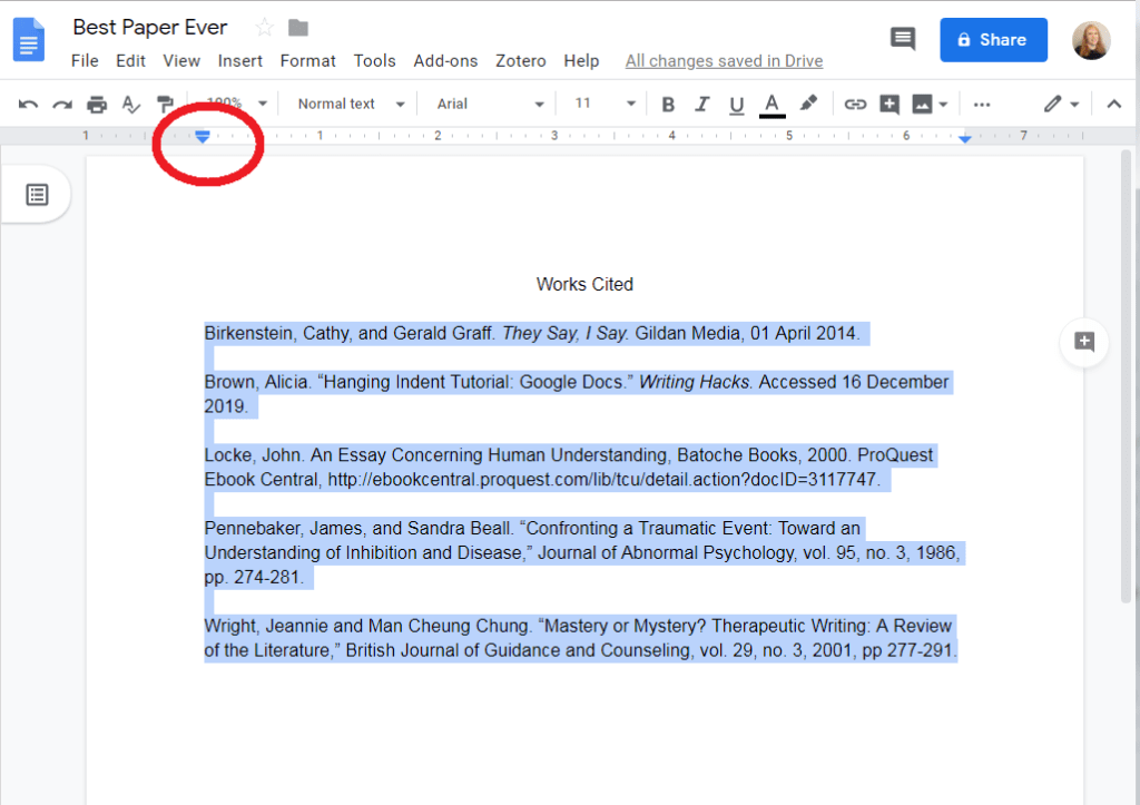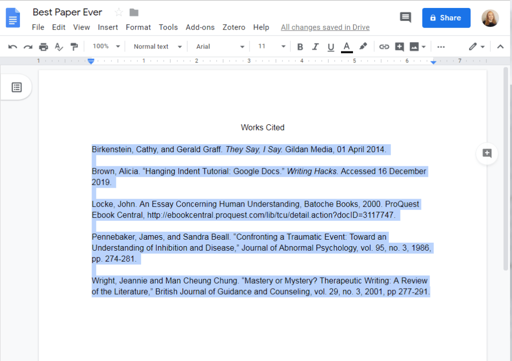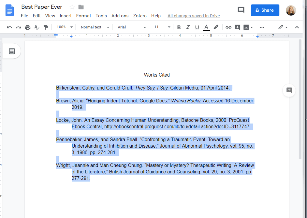 Once you have your works cited page, you need to give the entries a hanging indent. First, highlight the entries: